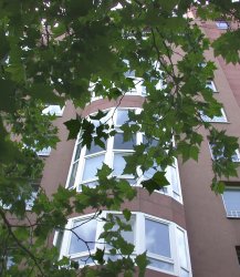 einem mittleren Geschoß beobachtet uns mißtrauisch. Sehen wir aus wie Immobilienhaie?