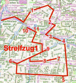Wir gehen auf dem Kurfürstendamm am brandgeschwärzten Hauptturm der neoromanischen Kaiser-Wilhelm-Gedächtnis-Kirche vorbei die Tauentzienstraße entlang. Zur Linken lassen wir die Marburger Straße liegen und biegen einige